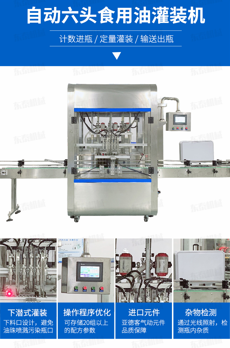 核桃油灌裝旋蓋生產(chǎn)線采用伺服柱塞式計(jì)量灌裝原理,適用于各種規(guī)格(0.1-1升可兼顧到2升灌裝)的南瓜籽油、榛子油、牡丹籽油、芝麻油、核桃油、山茶油、亞麻籽油、棉籽油、橄欖油、大豆油、玉米油、菜籽油等食用油灌裝。設(shè)備采用伺服系統(tǒng)定量推料,在人機(jī)界面數(shù)字化調(diào)節(jié)計(jì)量,并且可設(shè)定100ml或200ml等所需計(jì)量,觸摸屏一觸即達(dá),而且可以單頭微調(diào)計(jì)量。操作簡(jiǎn)單,維護(hù)方便,節(jié)省人工成本,生產(chǎn)效率更高。